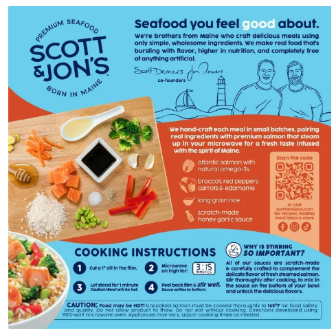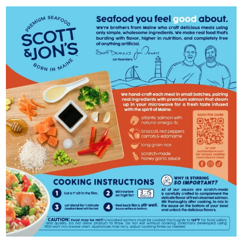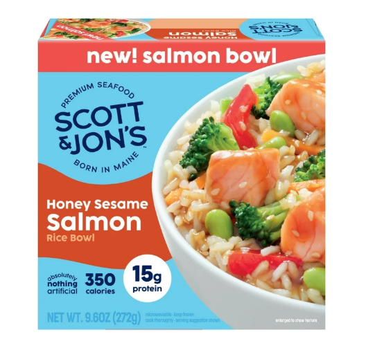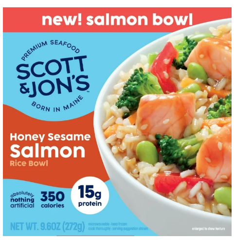 Finally, a quick & delicious way to enjoy salmon anytime with Scott & Jon’s Honey Sesame Salmon bowl, regular size. Our bowls steam up fresh in your microwave in just 3 minutes, for a tasty meal that leaves you feeling light and satisfied. We hand-craft each salmon bowl in small batches, pairing the finest Atlantic Salmon with crisp red bell peppers, broccoli, carrots & edamame on a bed of rice, tossed in our scratch-made asian honey sesame sauce. Delivering meals that are packed with goodness, higher in nutrition, and free of anything artificial. Find them now in the freezer section of your favorite grocer. Only 350 calories with 15g of Protein per bowl. Preparation Instructions 1. Cut a 1” slit in the film. 2. Microwave on high for 4:00 minutes. 3. Let stand for 1 minute. Caution! The bowl will be hot. 4. Peel back the film,?stir thoroughly & enjoy!
