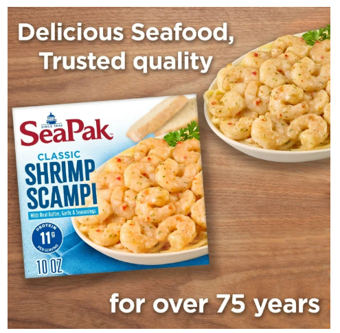 America’s # 1 frozen shrimp scampi never disappoints! Our whole tail-off shrimp scampi comes perfectly seasoned in a delicious garlic butter sauce with a hint of red bell pepper and herbs for extra flavor. We work hard to make your mealtimes easy. That’s why the SeaPak Shrimp & Seafood Company is the #1 retail brand in the frozen specialty seafood category. SeaPak is committed to making great tasting, high quality seafood products. For nearly 75 years, we’ve offered up the highest-quality, best tasting shrimp and seafood. We’re the shrimp experts, and we’re proud of it. And because we love it so much, we’re known for the care and attention we put toward choosing only the best seafood for all our products. Does not contain: eggs, peanuts, tree nuts, wheat, gluten, soybean, sesame. CONTAINS: SHRIMP, MILK. CONTAINS A BIOENGINEERED FOOD INGREDIENT. Seafood made simple—and EBT/SNAP eligible!