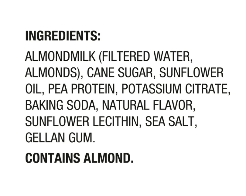 Almondmilk (Filtered Water, Almonds), Cane Sugar, Sunflower Oil, Pea Protein, Potassium Citrate, Baking Soda, Natural Flavor, Sunflower Lecithin, Sea Salt, Gellan Gum.