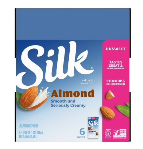 Bring the creamy goodness of almond milk to your pantry with Silk Shelf-Stable Unsweetened Almondmilk. Featuring a pure, silky-smooth taste and just 30 calories per serving, this unsweetened almond milk is delicious whether it’s poured over cereal, added to your favorite recipes or enjoyed straight out of the glass. It makes a perfect non-dairy alternative to milk, and is totally free of dairy, soy, lactose, gluten, casein, egg and MSG.