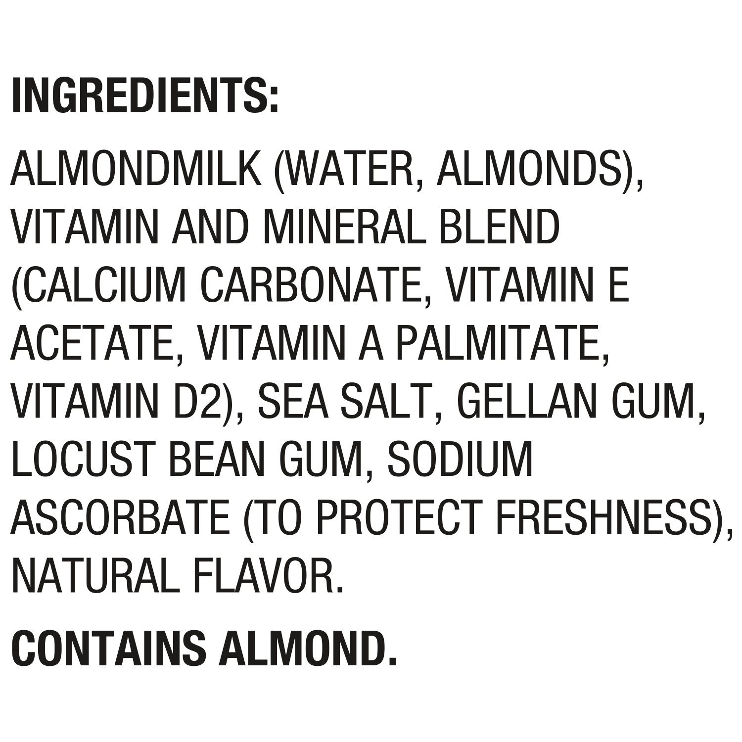 Ingredients: almondmilk (water, almonds), vitamin and mineral blend (calcium carbonate, vitamin e acetate, vitamin a palmitate, vitamin d2), sea salt, gellan gum, locust bean gum, sodium ascorbate (to protect freshness), natural flavor. Contains almond.
