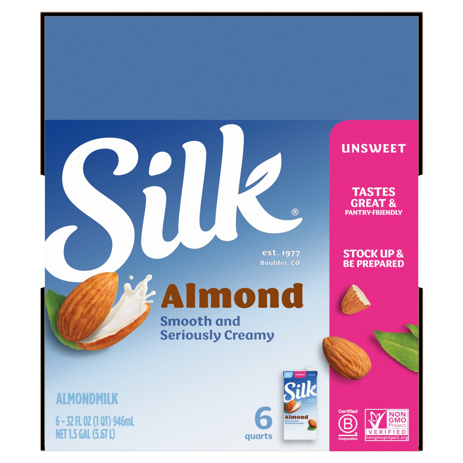 Bring the creamy goodness of almond milk to your pantry with Silk Shelf-Stable Unsweetened Almondmilk. Featuring a pure, silky-smooth taste and just 30 calories per serving, this unsweetened almond milk is delicious whether it’s poured over cereal, added to your favorite recipes or enjoyed straight out of the glass. It makes a perfect non-dairy alternative to milk, and is totally free of dairy, soy, lactose, gluten, casein, egg and MSG.