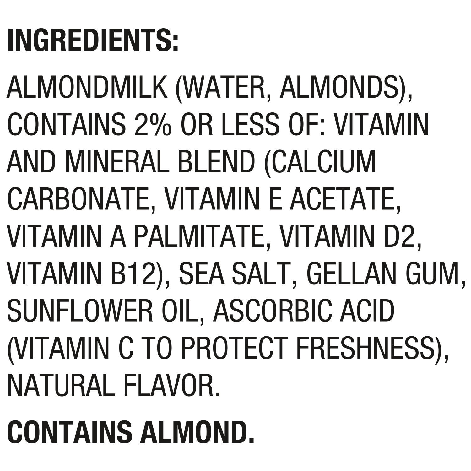 Ingredients: Almondmilk (filtered water; almonds); contains 2 or less of: vitamin and mineral blend calcium carbonate; vitamin e acetate; vitamin a palmitate; vitamin d2); sunflower and/or almond and/or canola oil; sea salt; gellan gum; ascorbic acid (vitamin c to protect freshness); natural flavor.
