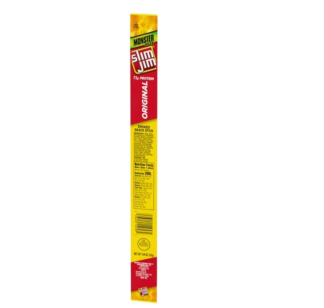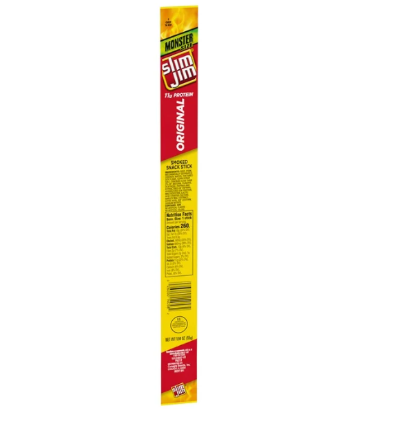 Experience intense, smoky flavor with delicious Slim Jim Monster Size Original Meat Stick. Made with spicy beef, pork and chicken, these snack sticks contain no artificial flavors or colors for full meaty flavor everyone can love. Each meat stick serving is loaded with 11 grams of protein, ideal for protein snacks that kick hunger to the curb and leave you feeling satisfied. These individually wrapped snacks go where you go and are perfect as travel snacks, school snacks or anywhere meat snacks. Slim Jim Monster Size Original Meat Sticks offer a bold and tasty way to take on the day. Each package contains one of the meat sticks, perfect as individual snacks when savory cravings hit. Slim Jim keeps it interesting with a full line of beef sticks, snack sticks, pork rinds and jerky. Snap into a Slim Jim(R)!