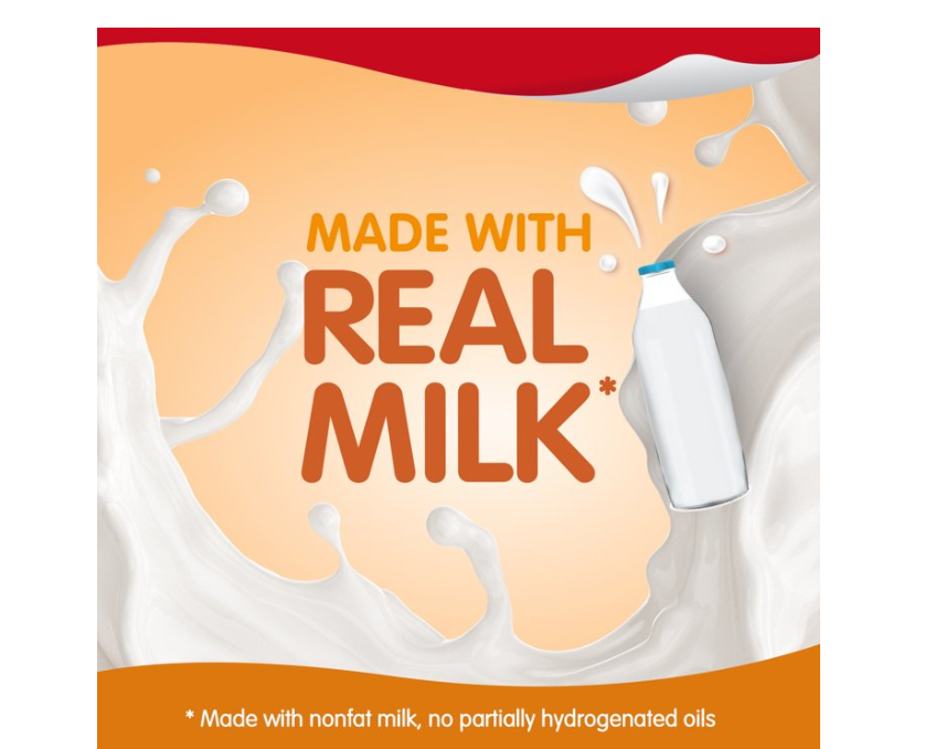 Water, Nonfat Milk, Sugar, Modified Corn Starch, Palm Oil, Less than 2% of: Salt, Caramel Color, Sodium Stearoyl Lactylate, Disodium Phosphate, Natural and Artificial Flavors, Yellow 6, Yellow 5.