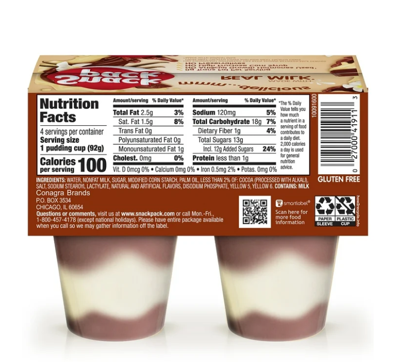 - Four count packs of Snack Pack Chocolate Vanilla Flavored Pudding Cups