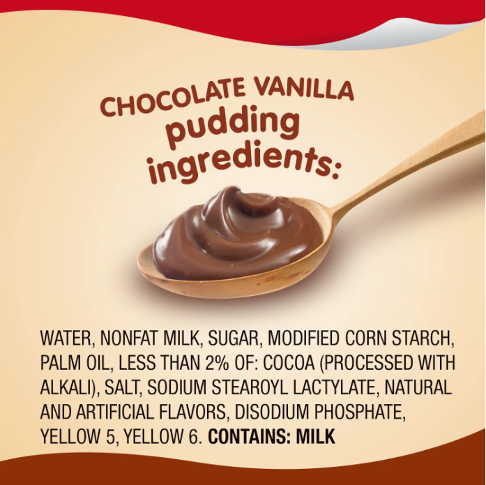 Water, Nonfat Milk, Sugar, Modified Corn Starch, Palm Oil, Less than 2% of: Cocoa (Processed with Alkali), Salt, Sodium Stearoyl Lactylate, Natural and Artificial Flavors, Disodium Phosphate, Yellow 5, Yellow 6._x000D_ CONTAINS: MILK