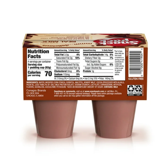 - One 4 count pack of Snack Pack Zero Sugar Chocolate Pudding Cups