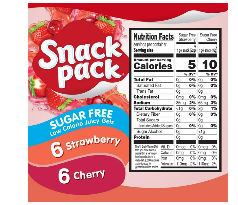 Delight in a quick and tasty treat any time of day with Snack Pack Zero Sugar Strawberry and Cherry Flavored Juicy Gels. Featuring bold, fruity flavor with zero sugar—these gel snacks deliver classic strawberry and cherry tastes for a deliciously sweet treat without the guilt. Not only are these snacks delicious and convenient, but they are made with real fruit juice, have zero sugar, are gluten free, and contain no preservatives or high fructose corn syrup. Each Juicy Gels zero sugar snack cup has 5 calories and is keto friendly*. Each Snack Pack Juicy Gels snack cup is a convenient size and does not need to be refrigerated, making this a reliable treat that is easy to pack and take with you to work for office snacks, in your kids’ lunch boxes for school snacks, or anywhere for easy kids snacks and keto desserts*. These snack cups also make an easy after-dinner treat or dessert for the entire family. If you want to add some extra excitement to these gel cups, try topping them with whipped cream and sprinkles or chopped fruit for easy desserts or gel fruit cups.