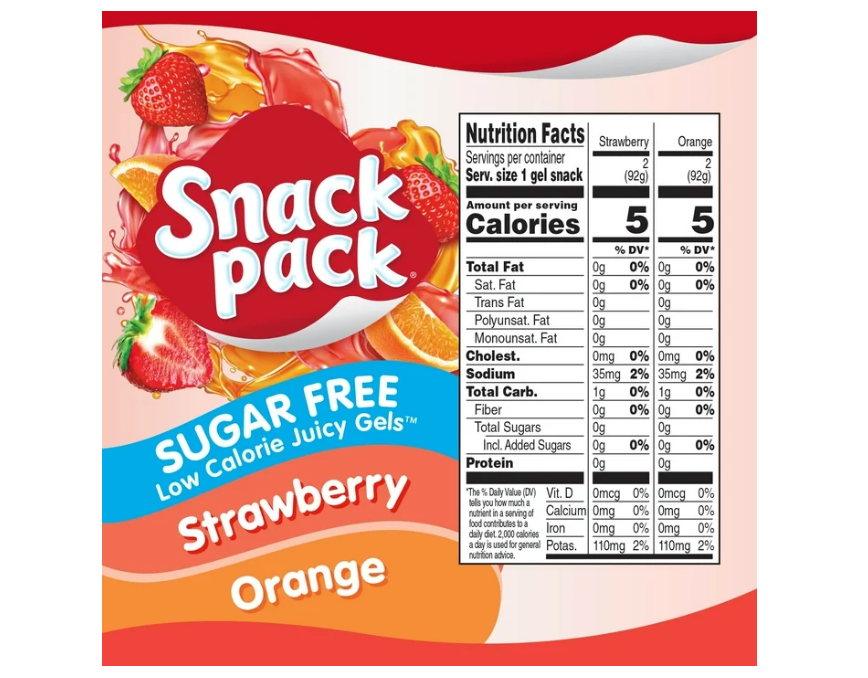 Four count packs of Snack Pack Zero Sugar Strawberry and Orange Flavored Juicy Gels