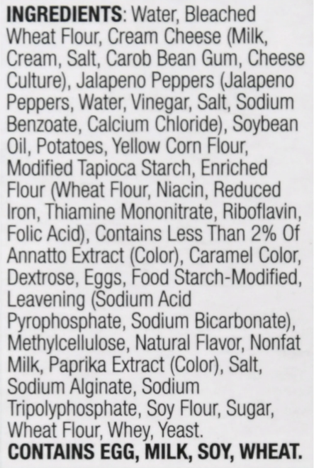 - One 5 oz box of regular Snapps Frozen Appetizers Real Cream Cheese and jalapenos Nestled in a Golden, Crispy Breading
