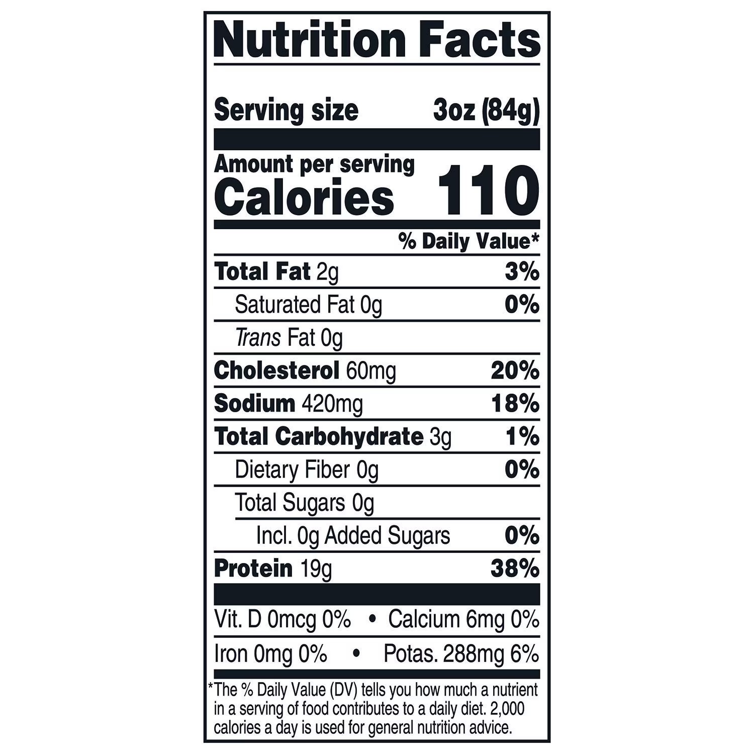 Boneless skinless chicken breast with rib meat, water, seasoning (tapioca starch, garlic powder, onion powder, spices, vinegar, sea salt, yeast extract, dextrose, chicken broth, potato starch, citrus extract, mustard)