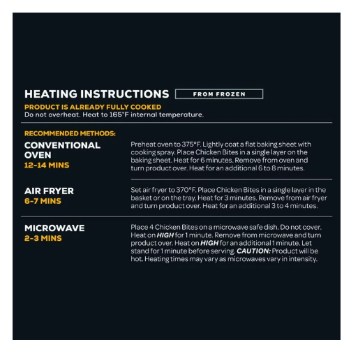 Heat to 165F internal temperature. Do not overheat. Product is already fully cooked. Conventional Oven: 12-14 Minutes (Recommended Method). Preheat oven to 375F. Spray pan release on a flat baking sheet. Place frozen Southern Style Chicken into one layer on baking sheet. Bake for 6 minutes, remove from oven and turn product over. Bake for an additional 6-8 minutes. Microwave: 2-3 Minutes. Place 4 frozen Southern Style Chicken pieces on microwave safe dish, do not cover. Heat on High for 1 minute. Remove from microwave, turn product over and heat on High for an additional 1 minute. Remove from microwave and let stand for 1 minute before serving. Caution: Product will be hot. Cook times may vary as microwaves vary in cooking intensity. --- Keep frozen.