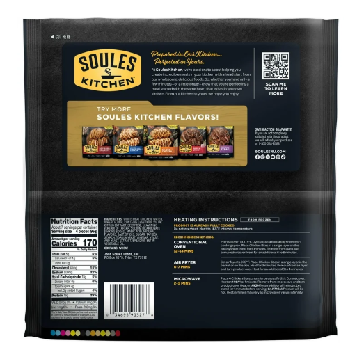 Soules Kitchen, Fully Cooked, All Natural, Frozen Southern Style Chicken Breast Bites, Family Size, 24 oz. Party Favorite! Great Snack! The Customer Matters to Us. At Soules Kitchen our goal is to give you the best product we can make. We use premium white meat chicken, superior breading, flavorful blends of seasoning and sauces to deliver the quality you expect. Great for kids and adults alike. Serve with your favorite finger foods. It is important to us that all of our products are made with the same care you would make for your family. From our kitchen to yours, enjoy. Great Food, Made Simple. Not a regular meal, but a fun and yummy one! Shellfish-Free.
