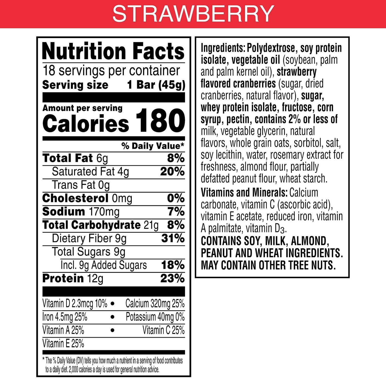 Ingredients: Polydextrose, soy protein isolate, vegetable oil (soybean, palm and palm kernel oil), strawberry flavored cranberries (sugar, dried cranberries, natural flavor), sugar, whey protein isolate, fructose, corn syrup, pectin, contains 2% or less of milk, vegetable glycerin, natural flavors, whole grain oats, sorbitol, salt, soy lecithin, water, rosemary extract for freshness, almond flour, partially defatted peanut flour, wheat starch. Vitamins and Minerals: Calcium carbonate, vitamin C (ascorbic acid), vitamin E acetate, reduced iron, vitamin A palmitate, vitamin D3.