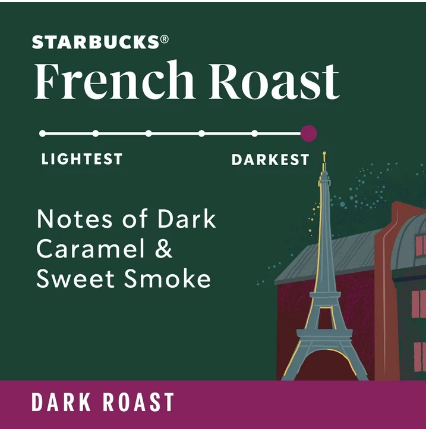 - STARBUCKS FRENCH ROAST COFFEE—With notes of dark caramel and sweet smoke, the intense and roasty flavor of Starbucks French Roast coffee is as dark as our dark roasts get