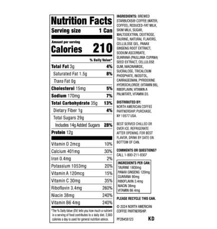 Starbucks Coffee Water, Coffee, Reduced-Fat Milk, Skim Milk, Sugar, Maltodextrin, Dextrose, Taurine, Natural Flavor, Cellulose Gel, Panax Ginseng Root Extract, Inositol, Sodium Ascorbate, Guarana Paullinia Cupana Seed Extract, Cellulose Gum, Niacinamide, Ascorbic Acid Vitamin C, Sucralose, Tricalcium Phosphate, Pyridoxine Hydrochloride Vitamin B6, Riboflavin, Vitamin A Palmitate, Vitamin D3