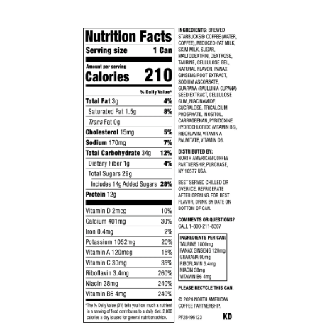 Brewed Starbucks Coffee (Water, Coffee), Reduced-Fat Milk, Skim Milk, Sugar, Maltodextrin, Dextrose, Taurine, Cellulose Gel, Natural Flavor, Panax Ginseng Root Extract, Sodium Ascorbate, Guarana (Paullinia Cupana) Seed Extract, Cellulose Gum, Niacinamide, Sucralose, Tricalcium Phosphate, Inositol, Carrageenan, Pyridoxine Hydrochloride (Vitamin B6), Riboflavin, Vitamin a Palmitate, Vitamin D3.