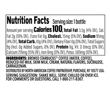 Brewed Starbucks Coffee (Water, Coffee), Reduced-Fat Milk, Skim Milk, Cream, Natural Flavors, Sucralose, Carrageenan.