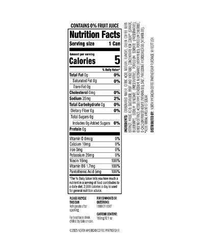 Carbonated Water, Citric Acid, Natural Flavors, Green Coffee Bean Extract, Malic Acid, Sucralose, Fruit and Vegetable Concentrate for Color* (Carrot, Blueberry), Sodium Benzoate (Preservative), Potassium Sorbate (Preservative), Ginseng Extract, Acesulfame Potassium, Niacinamide (Vitamin B3), Potassium Chloride, D-Calcium Pantothenate (Vitamin B5), Salt, Pyridoxine Hydrochloride (Vitamin B6). * Adds Trivial Amount of Sugar.