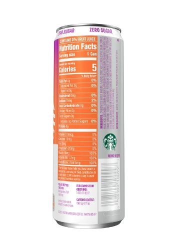 Carbonated Water, Natural Flavors, Citric Acid, Green Coffee Bean Extract, Malic Acid, Sucralose, Sodium Benzoate (Preservative), Potassium Sorbate (Preservative) Panax Ginseng Extract, Acesulfame Potassium, Niacinamide (Vitamin B3), Potassium Chloride, Ascorbic Acid, Beta Carotene (Color), D-Calcium Pantothenate (Vitamin B5), Salt, Pyridoxine Hydrochloride (Vitamin B6).