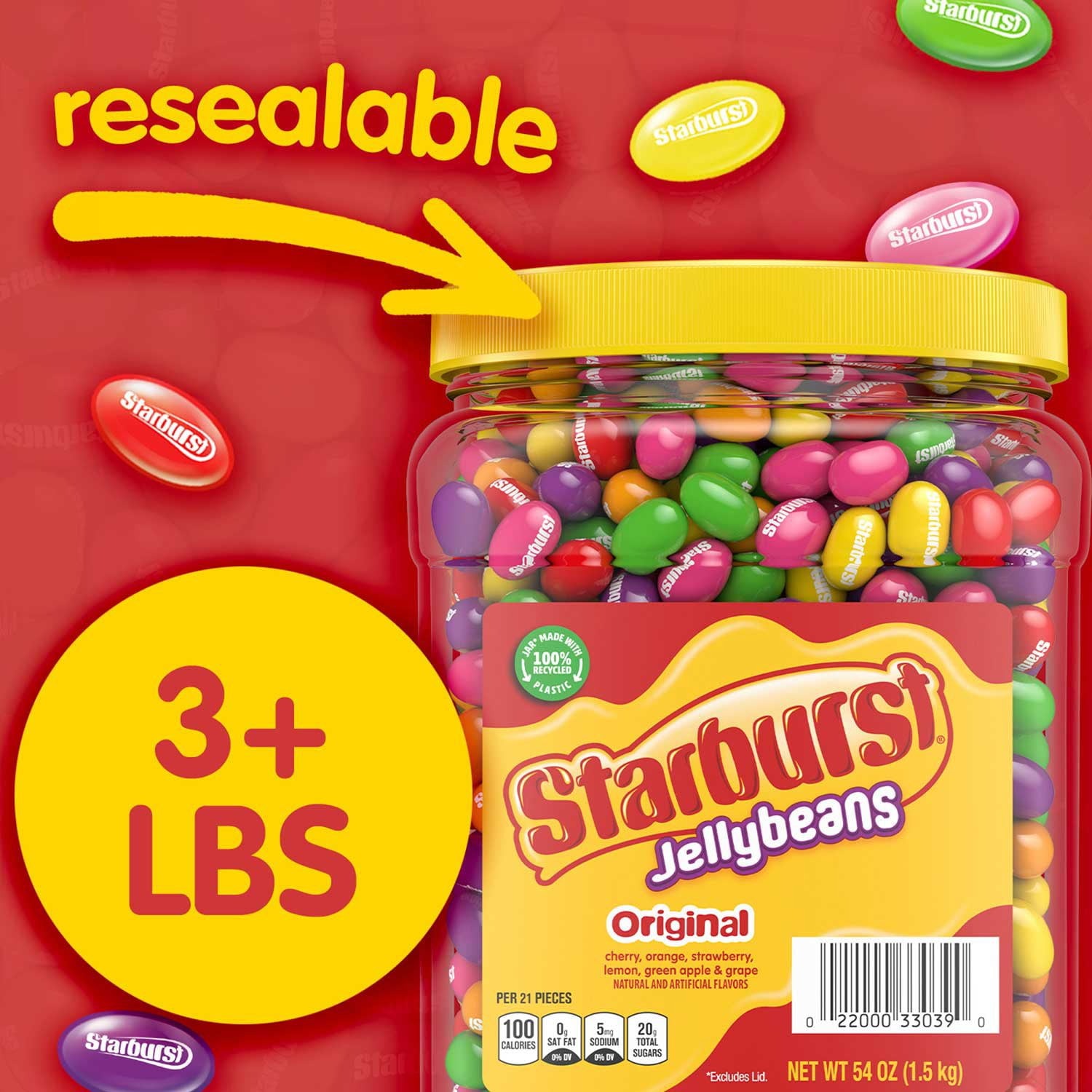 STARBURST Jellybeans are the perfect complement to any party favor or party gift. Stocked with everyone’s favorite STARBURST Original Fruit Candy flavors, this jar with a resealable lid featuring strawberry, cherry, orange, green apple, grape and lemon assortment is sure to sprout smiles on the faces of your friends and family. Stock up your office pantry with this bulk assorted candy jar of festive treats so you can fill candy dishes at the front desk with bold, fruity flavor. This sweet chewy candy treat is fat free and makes the perfect movie night candy, party snack or everyday treat to satisfy your sweet cravings. It even comes sealed in a bulk resealable jar to keep them fresh, and this jar of candy is easy to stack in your pantry. Whether you add them to your favorite recipes or enjoy them on their own, there are many fun ways to add a burst of fruity flavor to your party.