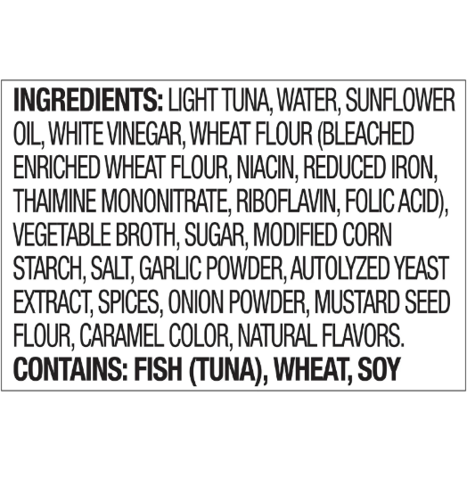 Light Tuna, Water, Sunflower Oil, White Vinegar, Wheat Flour (Bleached Enriched Wheat Flour, Niacin, Reduced Iron, Thiamine Mononitrate, Riboflavin, Folic Acid), Vegetable Broth, Sugar, Modified Corn Starch, Salt, Garlic Powder, Autolyzed Yeast Extract, Spices, Onion Powder, Mustard Seed Flour, Caramel Color, Natural Flavors.