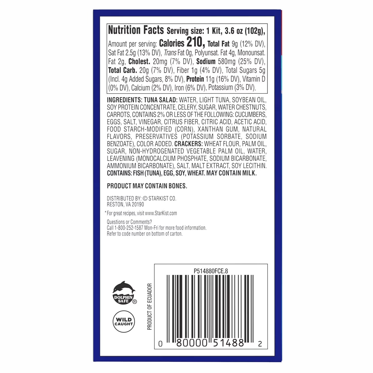 Tuna Salad Ingredients: water, light tuna. celery. soy protein concentrate, sugar, water chestnuts, carrots, vinegar, contains 2% or less of sweet pickle relish (cucumbers, sugar, distilled vinegar, salt, xanthan gum, colors [red cabbage extract, turmeric], preservatives [sodium benzoate, potassium sorbate] natural flavorings) salt, cellulose gel. color added, egg yolk, onion powder, xanthan gum, mustard flour, carrageenan. modified food starch, phosphoric acid, citrus fiber, preservatives (sodium benzoate, potassium sorbate), EDTA, carboxymethyl cellulose. Cracker Ingredients: wheat flour palm dill, sugar non-hydrogenated vegetable palm oil. water. leavening (monocalcium phosphate, sodium bicarbonate, ammonium bicarbonate), salt, malt extract, soy lecithin. Contains tuna, soy, egg, wheat. May contain milk. May contain bones.