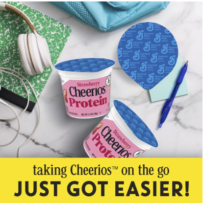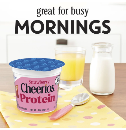 CONTAINS: One single serve plastic cup of crunchy Strawberry Cheerios Protein Single Serve Cereal Cup, 1.4 oz; Perfect for instant snacking, or a part of breakfast and meals