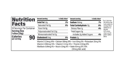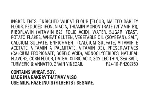 Enriched Wheat Flour [Flour, Malted Barley Flour, Reduced Iron, Niacin, Thiamin Mononitrate (Vitamin B1), Riboflavin (Vitamin B2), Folic Acid], Water, Sugar, Yeast, Potato Flakes, Wheat Gluten, Vegetable Oil (Soybean), Salt, Calcium Sulfate, Enrichment [Calcium Sulfate, Vitamin E Acetate, Vitamin A Palmitate, Vitamin D3], Preservatives [Calcium Propionate, Sorbic Acid], Monoglycerides, Natural Flavors, Corn Flour, Datem, Citric Acid, Soy Lecithin, Sea Salt, Turmeric & Annatto, Grain Vinegar.