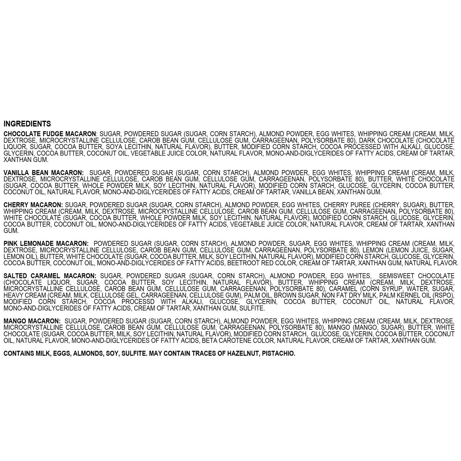 Salted Caramel Macaron: Confectioner’s Sugar (Sugar, Cornstarch), Almond Powder, Sugar, Egg Whites, Semisweet Chocolate (Chocolate Liquor, Sugar, Cocoa Butter, Soy Lecithin, Natural Flavor), Whipping Cream (Cream, Milk, Dextrose, Microcrystalline Cellulose, Carob Bean Gum, Cellulose Gum, Carrageenan, Polysorbate 80), Caramel (Corn Syrup, Water, Sugar, Heavy Cream (Cream, Milk, Cellulose Gel, Carrageenan, Cellulose Gum), Palm Oil, Brown Sugar, Non Fat Dry Milk, Palm Kernel Oil), Cocoa Processed With Alkali, Modified Corn Starch, Glucose, Glycerin, Cocoa Butter, Coconut Oil, Mono- And Diglycerides Of Fatty Acids, Natural Flavor, Cream Of Tartar, Xanthan Gum.