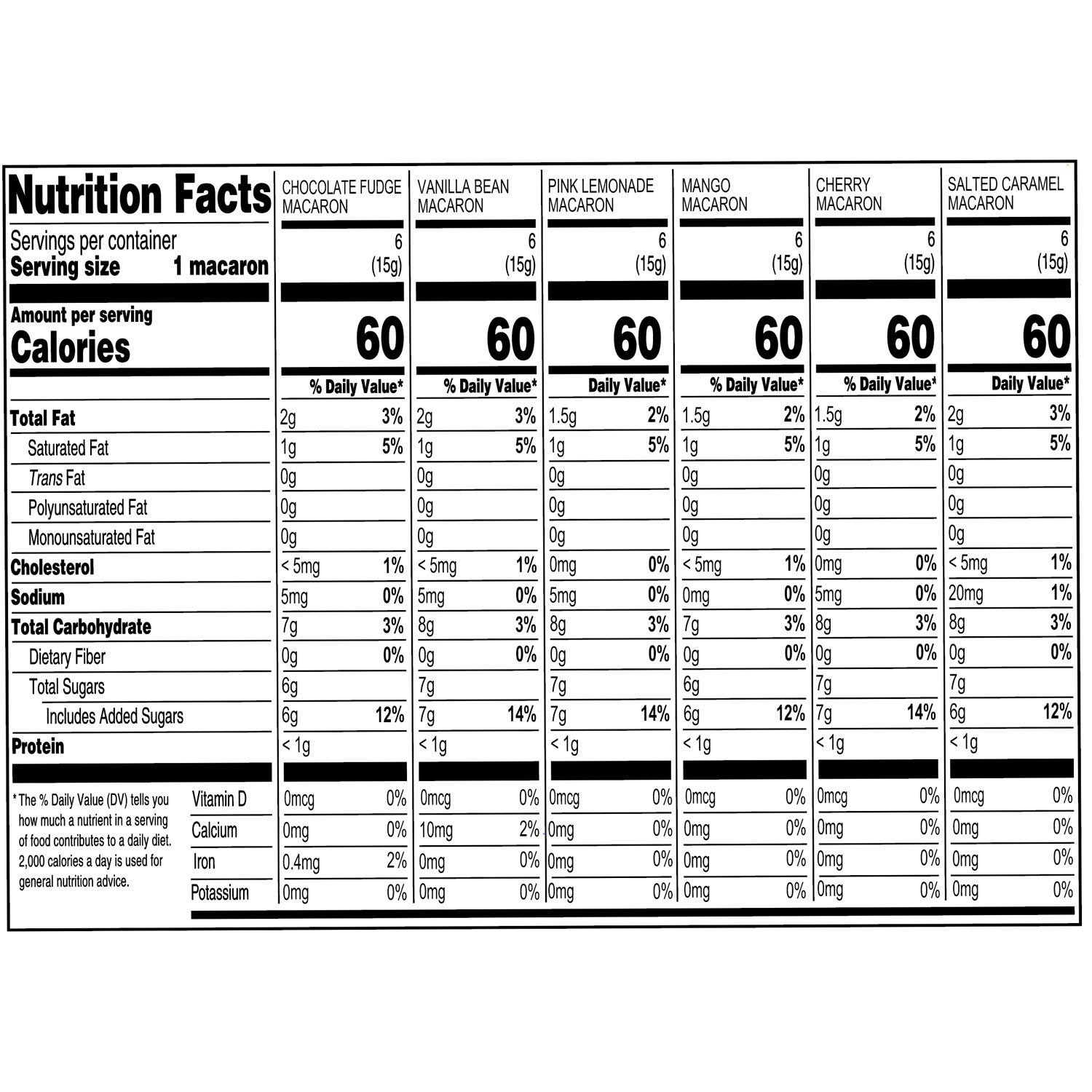 Chocolate Fudge Macaron: Confectioner’s Sugar (Sugar, Cornstarch), Almond Powder, Sugar, Egg Whites, Whipping Cream (Cream, Milk, Dextrose, Microcrystalline Cellulose, Carob Bean Gum, Cellulose Gum, Carrageenan, Polysorbate 80), Dark Chocolate (Chocolate Liquor, Sugar, Cocoa Butter, Soy Lecithin, Natural Flavor), Modified Corn Starch, Cocoa Processed With Alkali, Glucose, Glycerin, Cocoa Butter, Coconut Oil, Vegetable Juice Color, Mono- And Diglycerides Of Fatty Acids, Natural Flavor, Cream Of Tartar, Xanthan Gum.