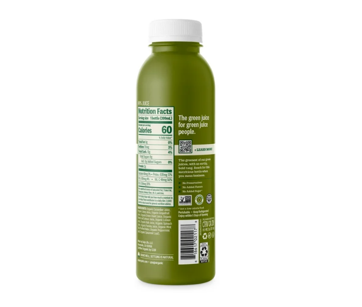 DRINK YOUR VEGETABLES: With 1.5 servings of fruits and vegetables and no added sugar, this organic green juice is like having a salad in a bottle