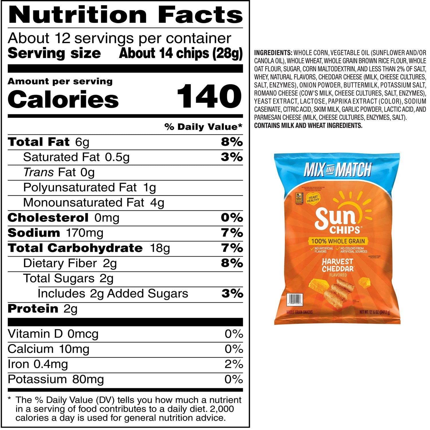 Ingredients: Whole Corn, Sunflower And/Or Canola Oil, Whole Wheat, Brown Rice Flour, Whole Oat Flour, Sugar, Maltodextrin (Made From Corn), Salt, Whey, Natural Flavors, Cheddar Cheese (Milk, Cheese Cultures, Salt, Enzymes), Onion Powder, Buttermilk, Potassium Salt, Romano Cheese (Cow's Milk, Cheese Cultures, Salt, Enzymes), Yeast Extract, Lactose, Paprika Extracts, Sodium Caseinate, Citric Acid, Skim Milk, Garlic Powder, Lactic Acid, And Parmesan Cheese (Milk, Cheese Cultures, Salt, Enzymes).