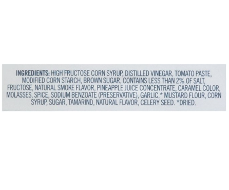 High Fructose Corn Syrup, Distilled Vinegar, Tomato Paste, Modified Corn Starch, Brown Sugar, Contains Less than 2% of Salt, Fructose, Natural Smoke Flavor, Pineapple Juice Concentrate, Caramel Color, Molasses, Spice, Sodium Benzoate (Preservative), Garlic (Dried), Mustard Color, Corn Syrup, Sugar, Tamarind, Natural Flavor, Celery Seed.