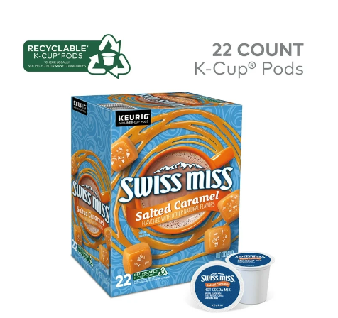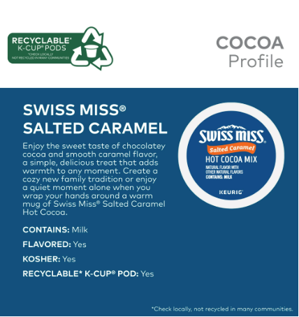 Nothing beats a cup of the delicious tasting Swiss Miss® Salted Caramel warm hot cocoa on a cold winter night! Now you can enjoy the sweet taste of chocolaty cocoa and smooth caramel flavor whenever you’re in the mood for a simple yet delicious treat that adds warmth to any moment. Create a cozy new family tradition or simply enjoy a quiet moment alone when you wrap your hands around a warm mug of Swiss Miss Salted Caramel Hot Cocoa. Swiss Miss has been creating the signature taste of hot chocolate since 1961 in a real dairy in Menomonie, Wisconsin. Made with dried milk and premium imported cocoa, each K-Cup® pod holds the perfect amount of Swiss Miss® Salted Caramel Hot Cocoa, creating a rich indulgent taste to sip and savor any time of day. Compatible with all Keurig Single Serve K-Cup® Pod Coffee Makers, Swiss Miss Salted Caramel Hot Cocoa is now easier to enjoy than ever before. RECYCLABLE* K-CUP® PODS: Simple. Delicious. And Recyclable. Enjoy the same great-tasting coffee you know and love, and when you’re done just peel, empty and recycle. *Check locally, not recycled in all communities. Packaging may vary.
