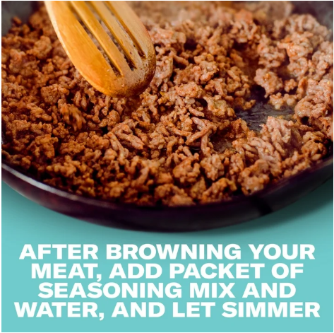After browning your meat, add our packet of seasoning mix and water, and let it simmer