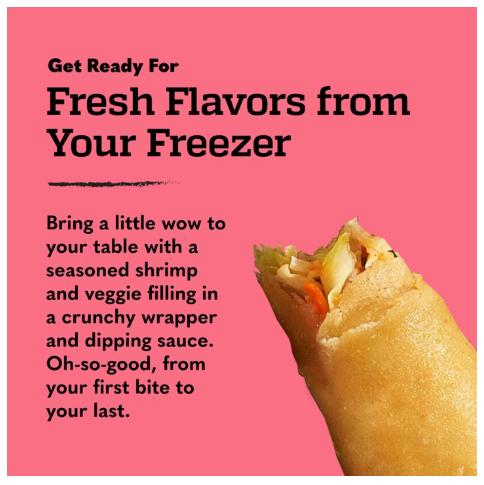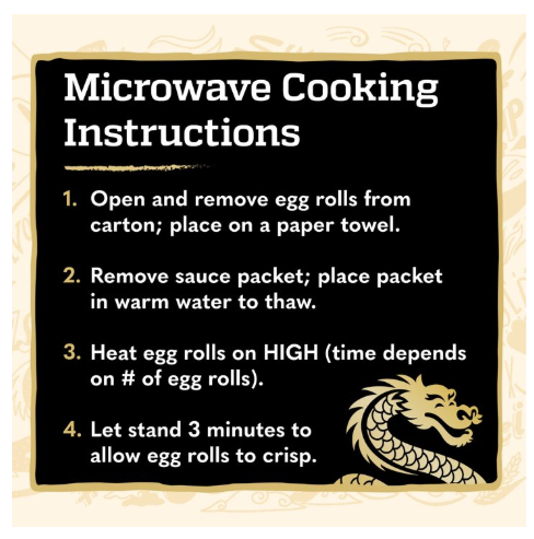 Heating Instructions: Recommended Oven/Toaster Oven: 1. Preheat oven to 450 degrees F. 2. Place egg rolls on a baking sheet. 3. Heat for 20 minutes. For best results, turn once during baking. 4. Let stand 3 minutes before serving. Air Fryer: 1. Preheat air fryer to 400 degrees F. 2. Remove 4 egg rolls from carton and inner bag. 3. Place egg rolls in air fryer basket. 4. Air fry for 10 minutes. 5. Let stand 3 minutes before serving. Sauce: Remove sauce packet, place packet in warm water to thaw. Microwave 1. Open and remove egg rolls from carton; place on a paper towel. 2. Heat egg rolls on high (see chart below). 3. Let stand 3 minutes to allow egg rolls to crisp. 1 egg roll- 1 minute; 2 egg - 1 minute 45 seconds; 3 egg rolls- 2 minutes 15 seconds; 4 egg rolls- 3 minutes. (based on a 1200 watt microwave). Important: Appliances may vary. Adjustments may be necessary to heat thoroughly. Keep frozen until ready to use. Store unused egg rolls in resealable container in freezer. Keep frozen.