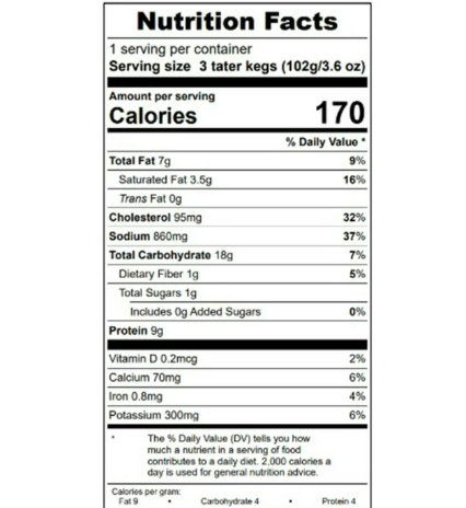 Introducing the Tater Kegs Cheese Bomb Tater Keg - the ultimate snack for any occasion! This delicious warm ready to eat tater keg is filled with crispy tater tots loaded with creamy cheese, sour cream and potatoes, perfect for a quick and easy meal or snack. With a convenient take away container including a handle and a fun design, this keg is sure to be a hit at any gathering. You get 3 Tater Kegs that are a generous serving of tasty tater tots and cheese that's sure to satisfy any appetite. So why wait? Stock up today and experience the deliciousness of the Tater Kegs Cheese Bomb Tater Keg! Contains: Milk, Egg, Soy