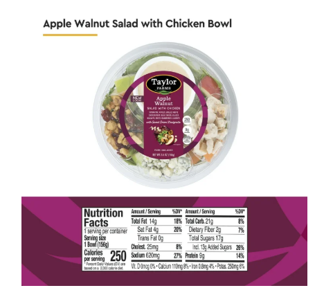 Sweet Onion Dijon Vinaigrette (Water, Canola Oil, Sugar, Dijon Mustard [Distilled Vinegar, Water, Mustard Seed, Salt, White Wine, Citric Acid, Turmeric, Tartaric Acid, Spices], Onion, Sweet Onion [Sweet Onion, Vinegar, Salt], White Wine Vinegar, Salt, Lemon Juice Concentrate, Dried Onion, Spices, Xanthan Gum, Natural Flavor), Apples (Apples and Calcium Ascorbate (to Maintain Freshness and Color]), Green Leaf Lettuce, Chicken Breast Meat with Rib Meat (Chicken Breast Meat with Rib Meat, Water, Cultured Sugar and Vinegar, Potato Starch, Sea Salt, Natural Flavorings), Spring Mix (May Contain Some or All of the Following Baby Whole Leaf Varieties: Green Leaf, Mizuna, Green Romaine, Tango, Green Oak, Green Chard, Spinach, Arugula, Frisee, Tatsoi, Red Chard, Red Leaf, Lolla Rosa, Red Romaine, Red Mustard, Radicchio, Red Oak, Beet Top), Blue Cheese Crumbles (Blue Cheese [Milk, Cheese Cultures, Salt, Enzymes], Powdered Cellulose to Prevent Caking, Natamycin to Protect Flavor), Honey Glazed Walnuts (Walnuts, Honey Powder [Sucrose, Wheat Starch, Honey], Honey Coating [Sugar, Honey, Maltodextrin, Salt, Corn Starch, Carrots {Color}, Gum Arabic, Xanthan Gum, Propylene Glycol, Molasses Powder {Refinery Syrup, Molasses}, Natural and Artificial Flavors {with Artificial Color}, Raisin Juice Concentrate, Citric Acid], Maltodextrin, Xanthan Gum, Vegetable Oil [May Contain One or More of the Following: Canola, Sunflower and/or Soybean], Sugar, Sea Salt), Cranberries (Cranberries, Sugar, Sunflower Oil), Carrot.