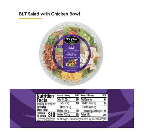 Want the taste of a mouthwatering BLT with none of the guilt? Ditch the carbs and try Taylor Farms BLT Salad with Chicken and Bacon. Enjoy vine ripened grape tomatoes, grilled white meat chicken, bacon, and cheddar cheese, all over a fresh blend of romaine, red cabbage, and carrots, with an avocado ranch dressing. Bacon, lettuce, and tomato sandwiches are a classic staple, but for those looking for the bold taste of a BLT without the hassle (or the carbs!), reach for this easy-to-open, ready to eat salad. With 14 grams of protein and 10% of your recommended daily iron intake, this salad is more filling and more satisfying. Use the enclosed fork, the prepackaged dressing, and go enjoy this meal anywhere--from the car to a picnic to your desk. At Taylor Farms, we’re proud to make wholesome fresh foods that nourish families across the country. From what began in 1995 in the sunny Salinas Valley in California--affectionately called America's Salad Bowl--to our growing family of farmers, we’re happy to be America’s favorite source for healthy, fresh foods.