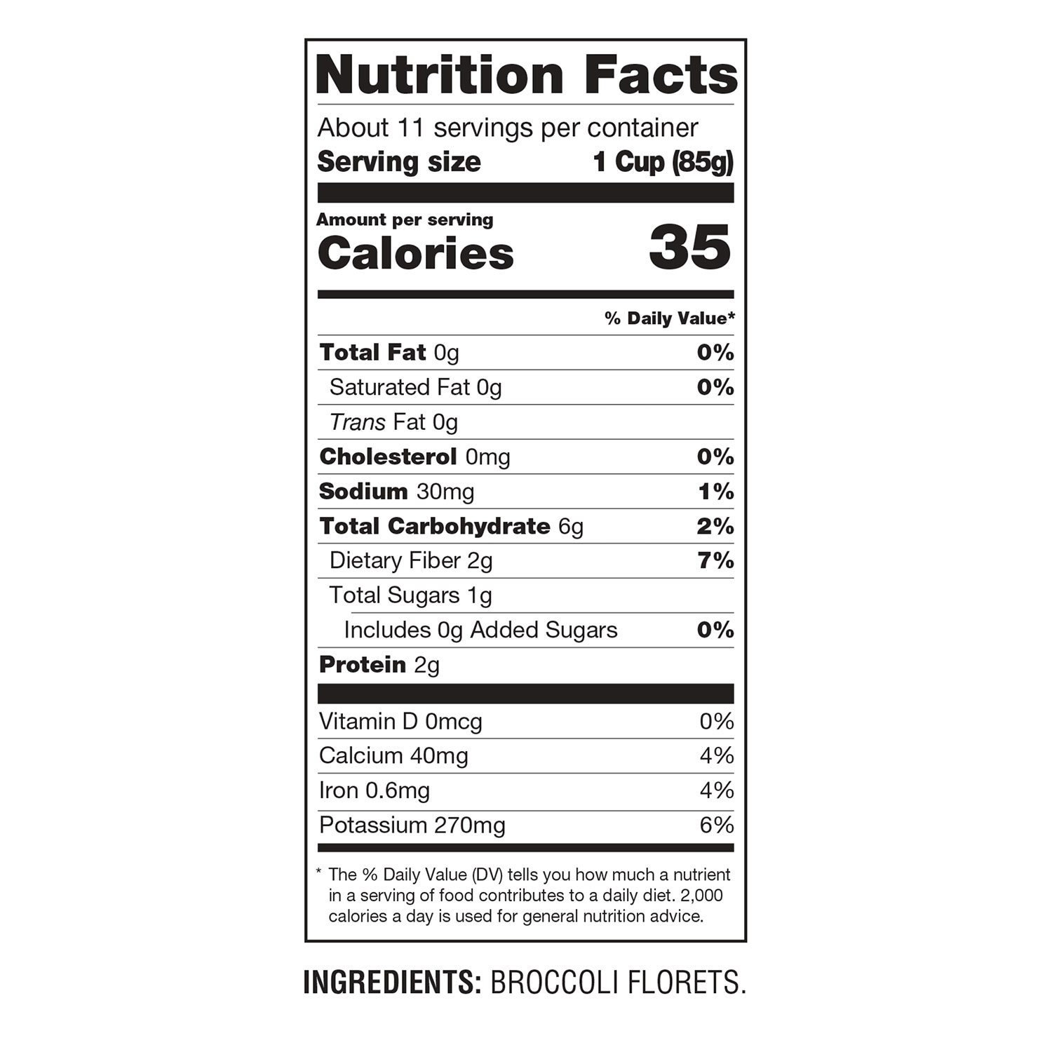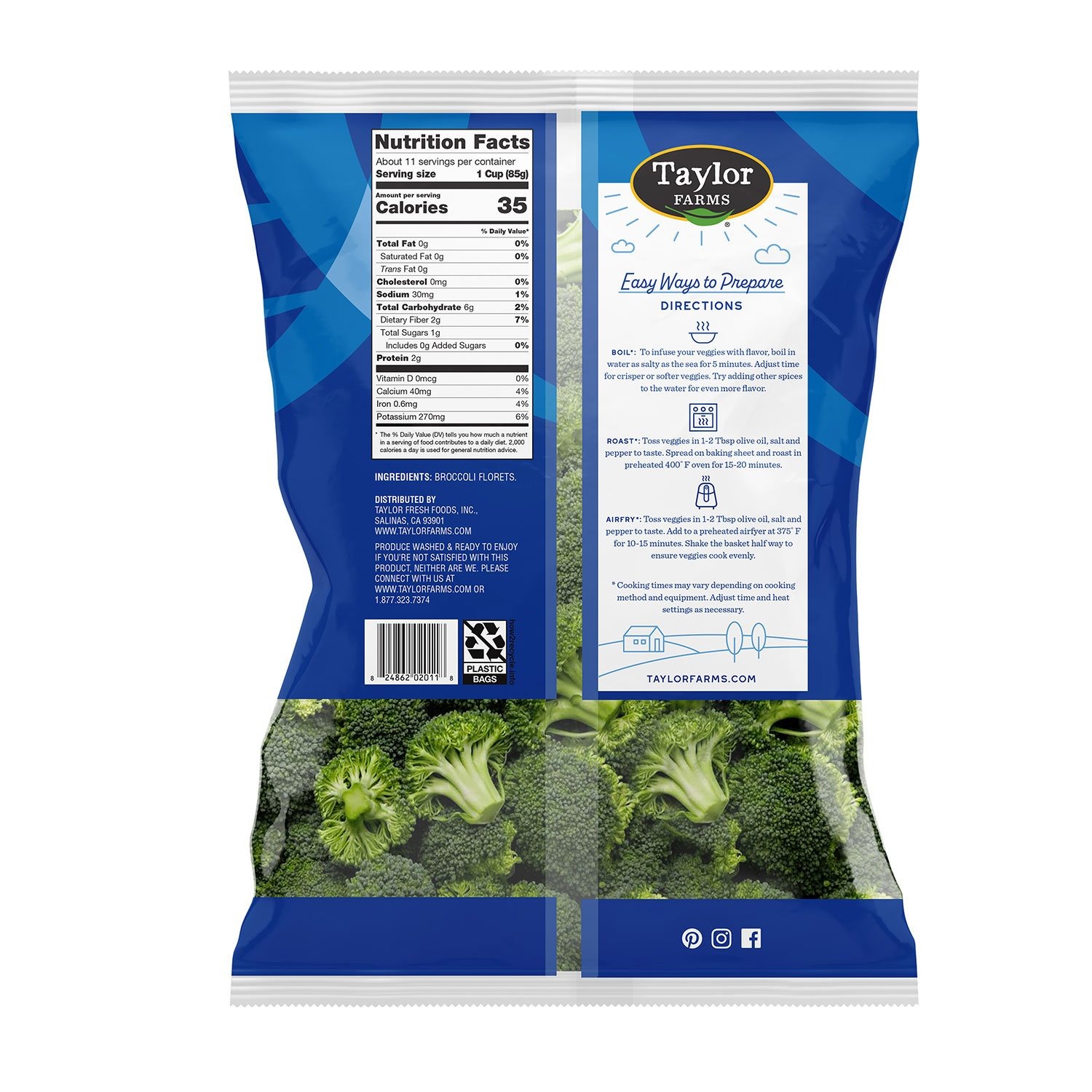Broccoli's noteworthy nutrients include vitamin C, vitamin A, folic acid, calcium and fiber. These broccoli florets are thoroughly washed and ready to enjoy. Enjoy them raw, boiled, steamed, baked or stir-fried.