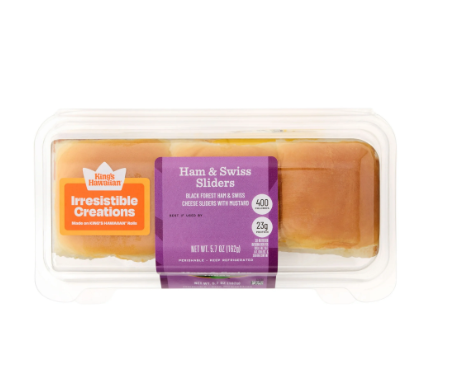Satisfy your cravings with Taylor Farms Ham & Swiss Sliders, featuring fully cooked Black Forest ham and Swiss cheese on soft King’s Hawaiian rolls with a hint of mild mustard. These sliders are a quick and delicious option for any meal or snack. Each serving provides 23g of protein and 400 calories, making them a filling and convenient choice. Perfect for lunch or on-the-go, these sliders are ready to enjoy straight from the fridge. Contains dairy, wheat, soy, & eggs; tree nut-free. Keep refrigerated to maintain freshness. Taylor Farms continues to offer wholesome, convenient meals to fit your busy lifestyle.