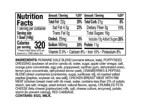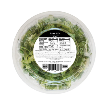 Savor the perfect blend of sweet and savory flavors with Taylor Farms Sweet Kale Chopped Salad Bowl. This fresh and vibrant salad features a mix of romaine and kale, grilled white meat chicken, dried cranberries, roasted pepitas, feta cheese, and red cabbage, all topped with creamy poppyseed dressing for a deliciously balanced taste. With 11g of protein per serving, this salad makes for a satisfying and wholesome meal. Ideal for busy lifestyles, this single-serving salad bowl is washed and ready to eat, with a convenient fork included for easy enjoyment. This product contains Eggs & Dairy but is Peanut-Free & Shellfish-Free. Taylor Farms is committed to delivering fresh, flavorful, and nutritious salads that make healthy eating simple and delicious.