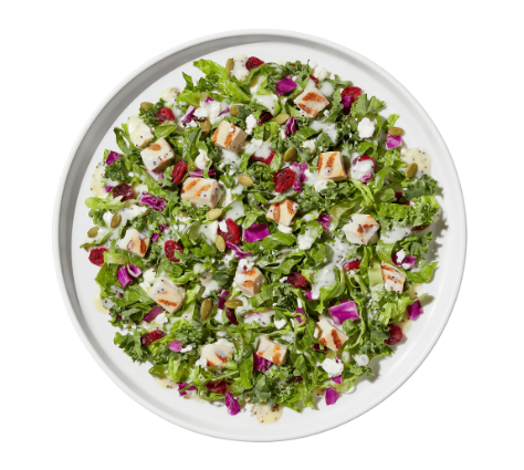 Includes romaine, kale, grilled chicken, dried cranberries, pepitas, feta cheese, and poppyseed dressing