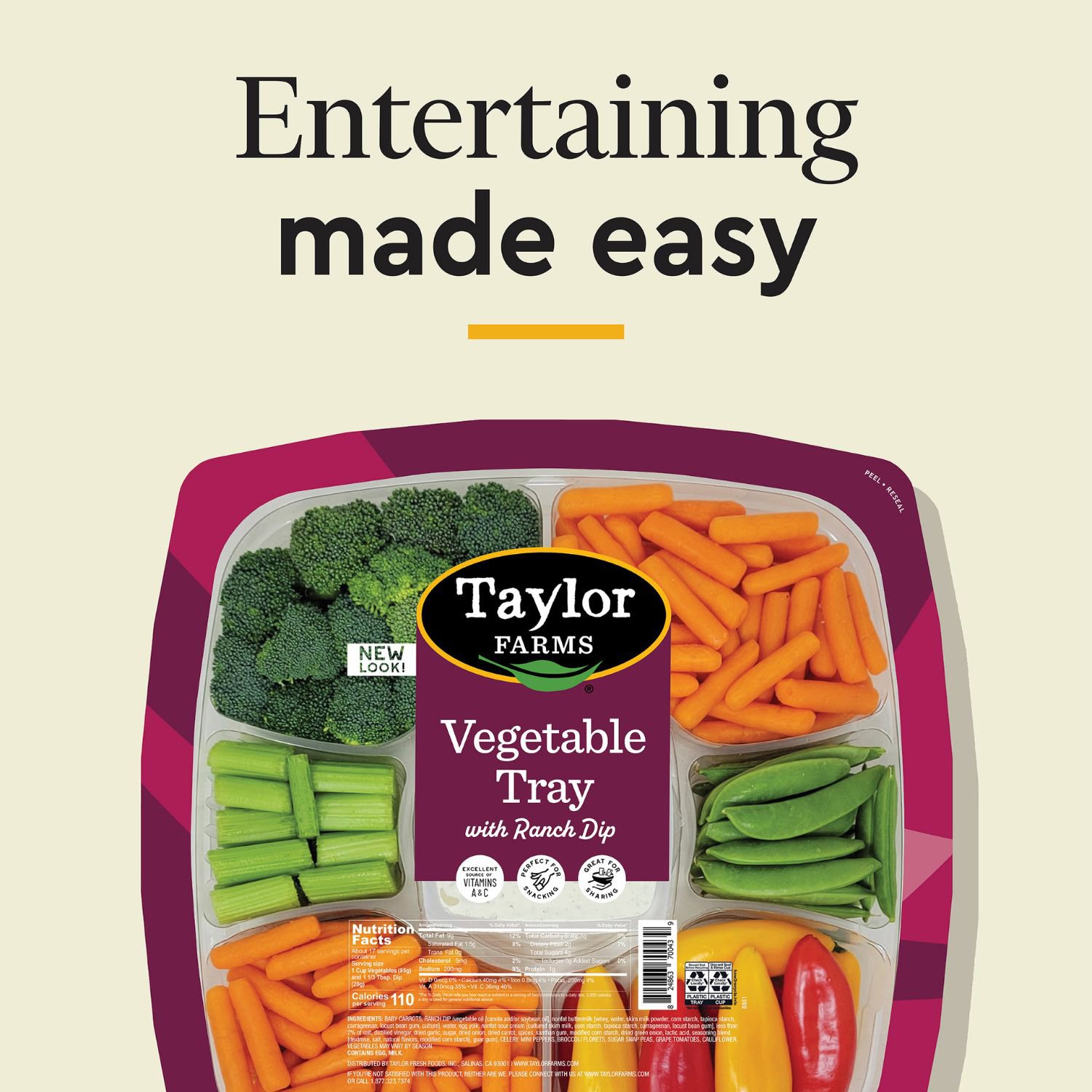 Ingredients: Baby Carrots, Ranch Dip (Vegetable Oil [Canola And/or Soybean Oil], Nonfat Buttermilk [Whey, Water, Skim Milk Powder, Corn Starch, Tapioca Starch, Carrageenan, Locust Bean Gum, Culture], Water, Egg Yolk, Nonfat Sour Cream [Cultured Skim Milk, Corn Starch, Tapioca Starch, Carrageenan, Locust Bean Gum], Less Than 2% Of Salt, Distilled Vinegar, Dried Garlic, Sugar, Dried Onion, Dried Carrot, Spices, Xanthan Gum, Modified Corn Starch, Dried Green Onion, Lactic Acid, Seasoning Blend [Dextrose, Salt, Natural Flavors, Modified Corn Starch], Guar Gum), Celery, Mini Peppers, Broccoli Florets, Sugar Snap Peas, Grape Tomatoes, Cauliflower.