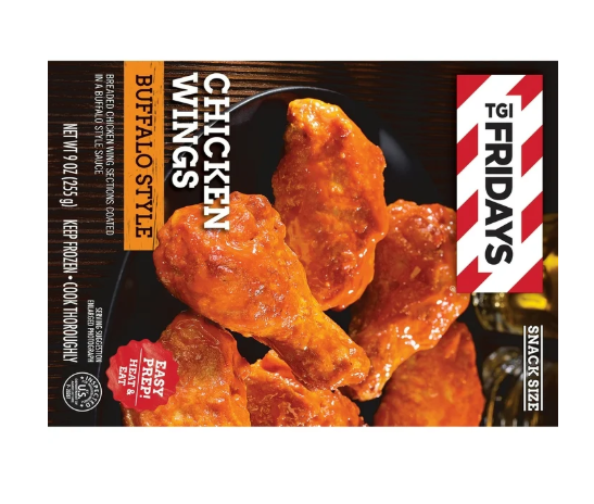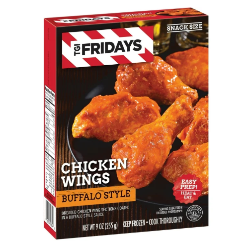 Enjoy your TGI Fridays menu favorites at home with our easy restaurant style appetizers. Ready to heat, TGI Fridays regular Buffalo Style Chicken Wings are a quick and delicious appetizer or party food. Our TGIF crispy breaded chicken wings are topped with buffalo style sauce. Packaged in a box for convenient storage, you can heat our buffalo style wings in a conventional oven or microwave. Store our 9-ounce box of buffalo style chicken wings in the freezer until ready to prepare. Whether you’re craving chicken wings, potato skins, spinach artichoke dip, chicken bites, mozzarella sticks, jalapeno poppers or sliders, TGI Fridays has frozen appetizers the whole family will enjoy. Regular