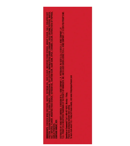 CHICKEN WING SECTIONS, WATER, SOYBEAN OIL, RICE FLOUR, MODIFIED FOOD STARCH, WHEAT FLOUR, SALT, ISOLATED SOY PROTEIN, SODIUM PHOSPHATES, CORN STARCH, CARRAGEENAN, SOY LECITHIN, BUFFALO STYLE SAUCE (VINEGAR, AGED CAYENNE PEPPERS, WATER, SALT, NATURAL FLAVOR, MODIFIED FOOD STARCH, SOYBEAN OIL, XANTHAN GUM, GUAR GUM, SPICE, CARAMEL COLOR, EXTRACTIVES OF PAPRIKA (COLOR), GARLIC POWDER).