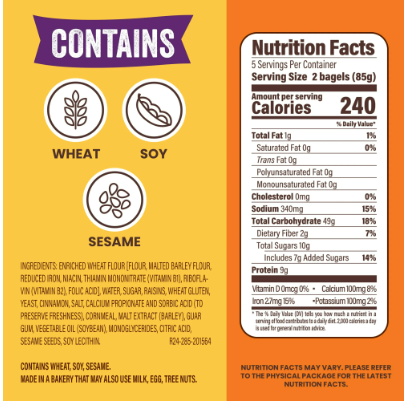 Enriched Wheat Flour [Flour, Malted Barley Flour, Reduced Iron, Niacin, Thiamin Mononitrate (Vitamin B1), Riboflavin (Vitamin B2), Folic Acid], Water, Sugar, Raisins, Wheat Gluten, Yeast, Cinnamon, Salt, Calcium Propionate And Sorbic Acid (To Preserve Freshness), Cornmeal, Malt Extract (Barley), Guar Gum, Vegetable Oil (Soybean), Monoglycerides, Citric Acid, Sesame Seeds, Soy Lecithin.