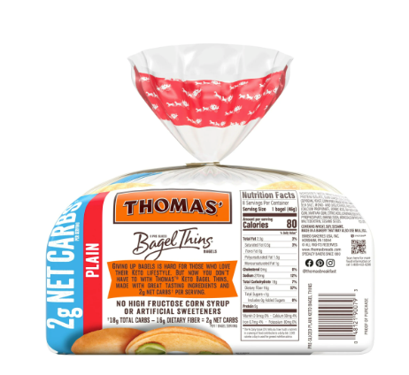 - Enjoy the delightful taste of Thomas' Bagel Thins Keto Plain Bagel Thins with two grams of net carbs per serving; no high fructose corn syrup or artificial sweeteners; Ou Kosher Parve certified
